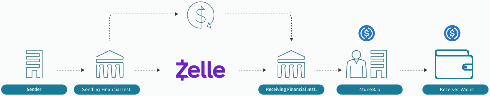 Customer sends/deposits USD to our 4tune8.io bank account via Zelle.